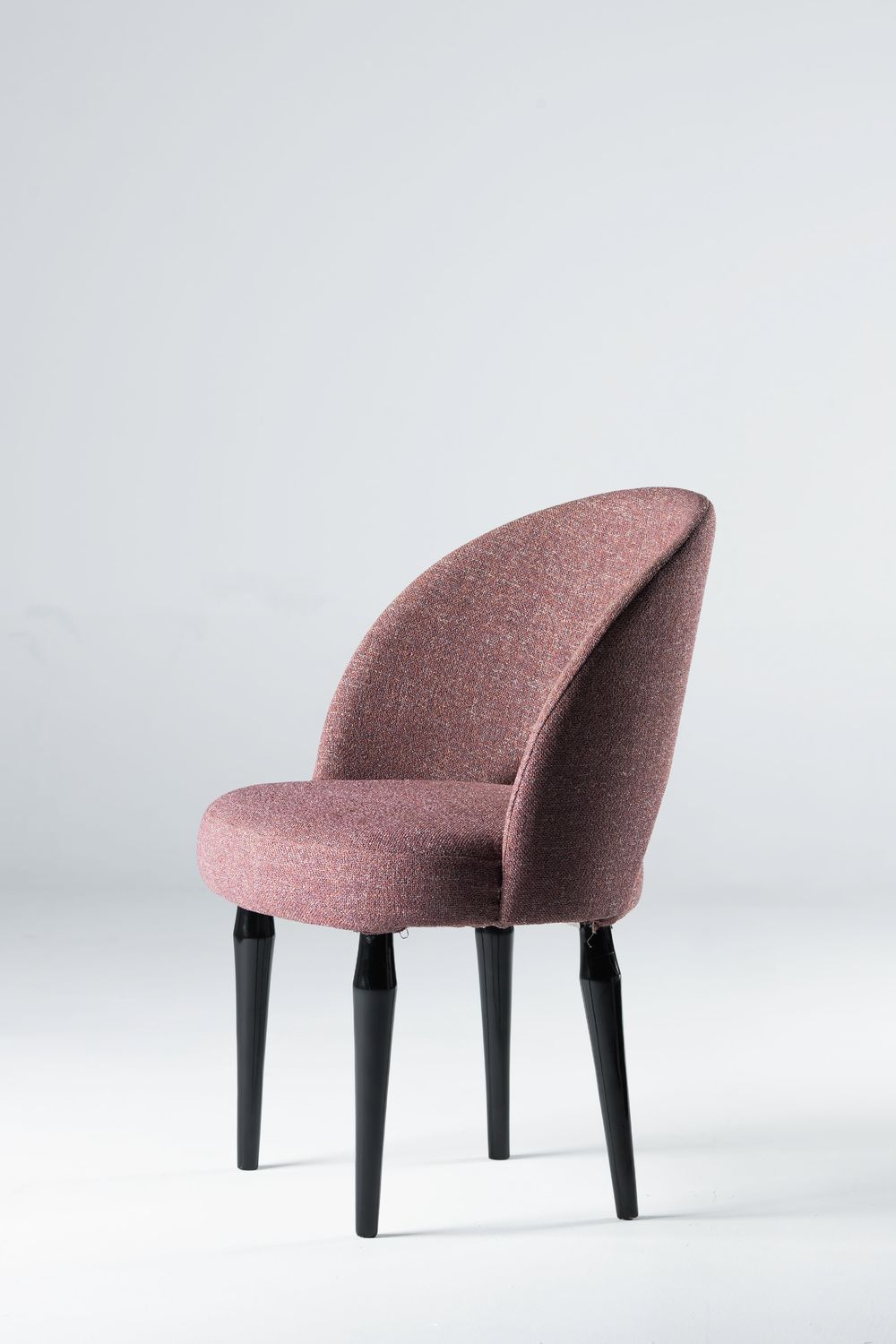 The Berry Weave Dining Chair infuses any space with a touch of colorful elegance and captivating design. It features a chic, rounded design that gently wraps around the sitter, entirely upholstered in a distinctive textured berry-toned fabric, blending deep pinks and purples. The chair rests on sturdy, glossy black wooden legs, creating a dramatic contrast and complementing its sophisticated appeal. Perfect as a dining chair that adds a bold splash of color or as a stylish accent piece in contemporary living areas.
