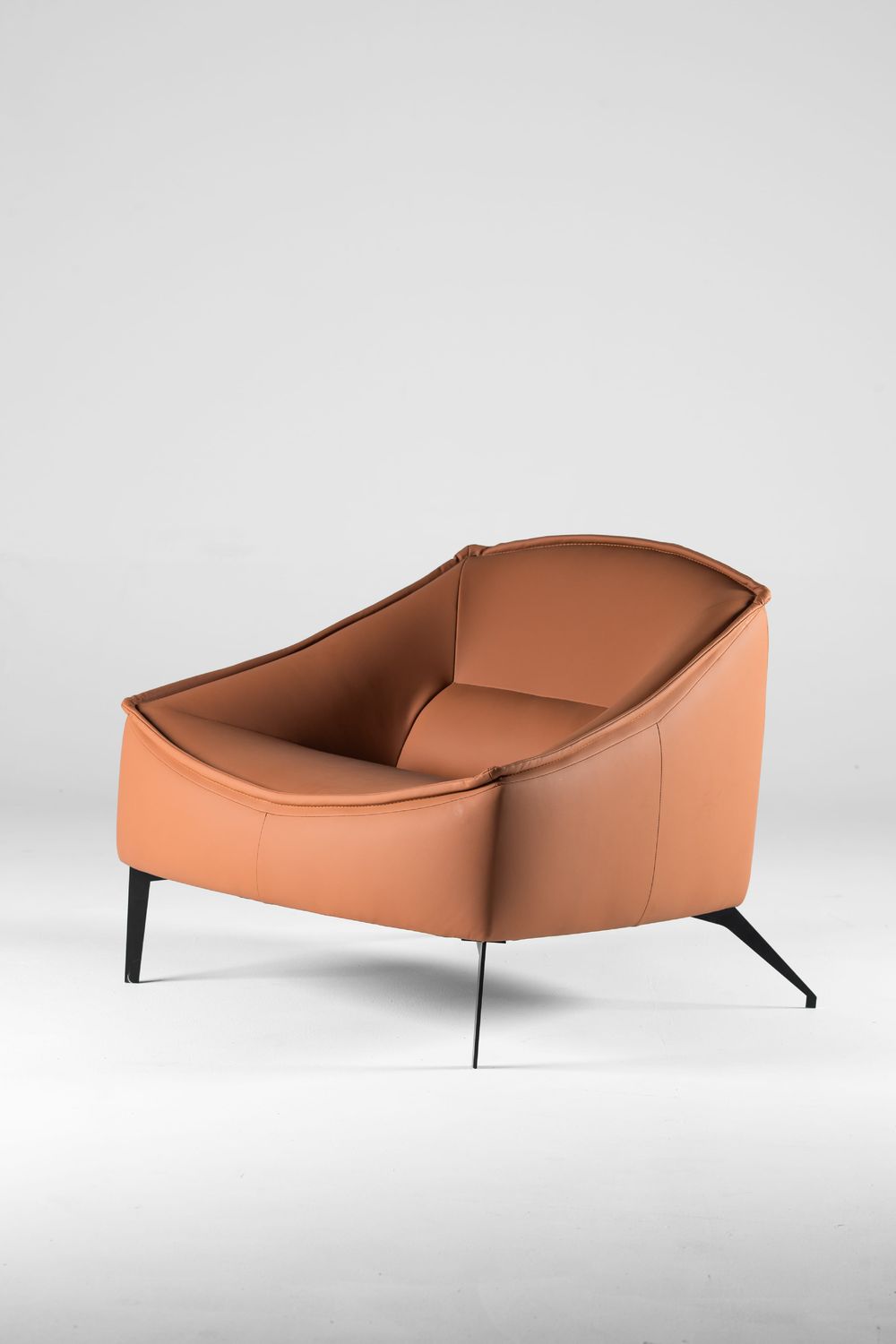 The Canyon Accent Chair is an artistic piece blending ultimate comfort with bold, contemporary design. It features luxurious caramel-toned leather upholstery, gracefully wrapping around the structure to form a comfortable seat and backrest. The chair rests on slender, matte black metal legs, adding a touch of industrial elegance and lightness. Perfect for introducing a distinctive and modern flair to any corner of your home or office.