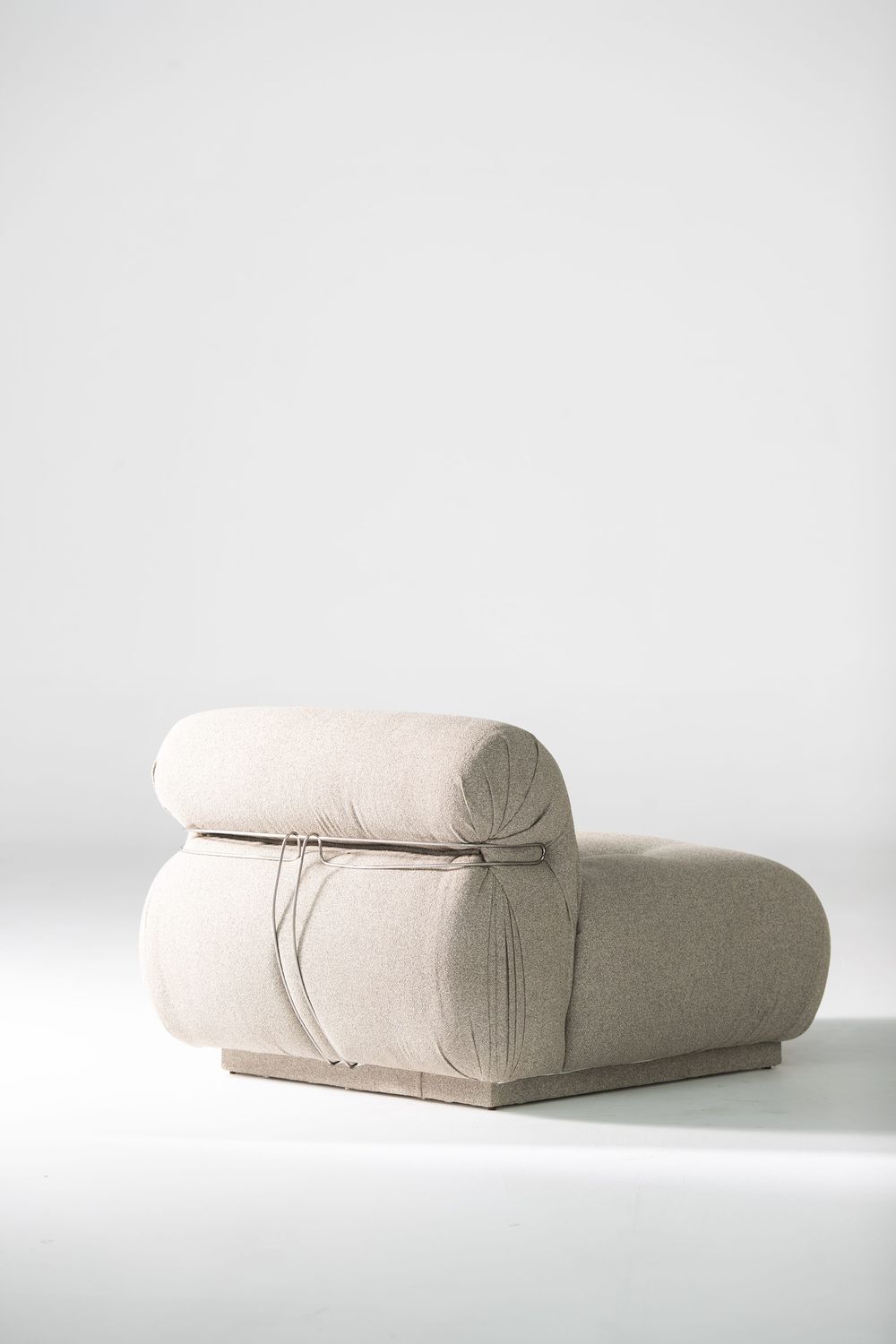 The Cocoon Comfort Lounge Chair is an invitation to ultimate relaxation with its curved and embracing design. It features a unique organic shape that envelops the sitter, generously padded and entirely covered in a thick, soft greige boucle fabric.