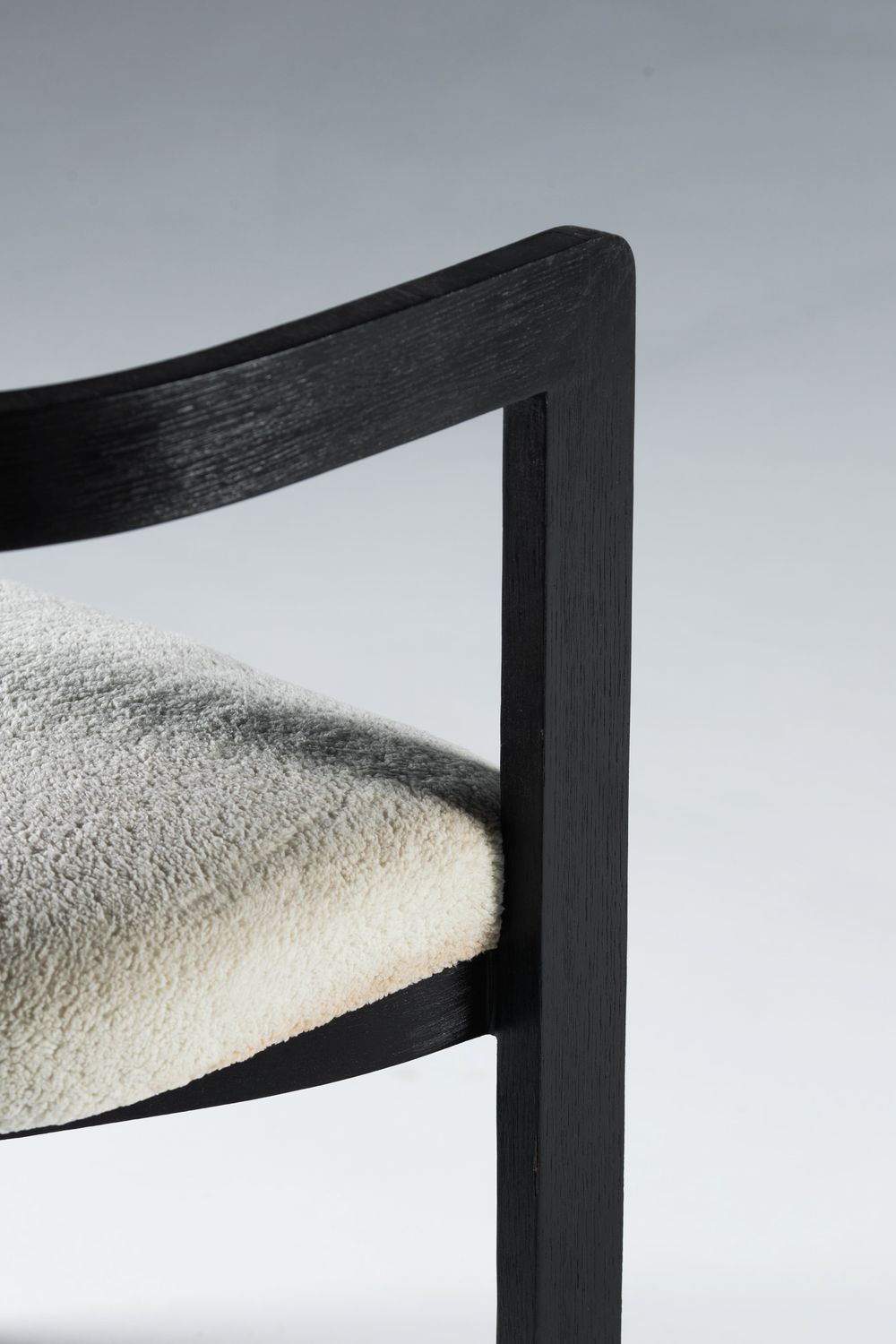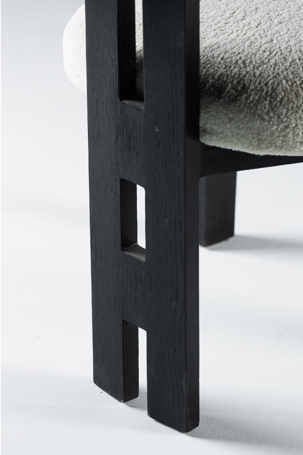 The Monolith Dining/Accent Chair embodies the strength of modern design and minimalist beauty. It features a rich, charcoal black solid wood frame that exudes dramatic character, with bold geometric lines and a comfortable seat upholstered in soft cream boucle fabric. The contrast between the dark black and the light fabric creates a striking and contemporary look. Perfect as a luxurious dining chair or a distinctive accent piece for any room.