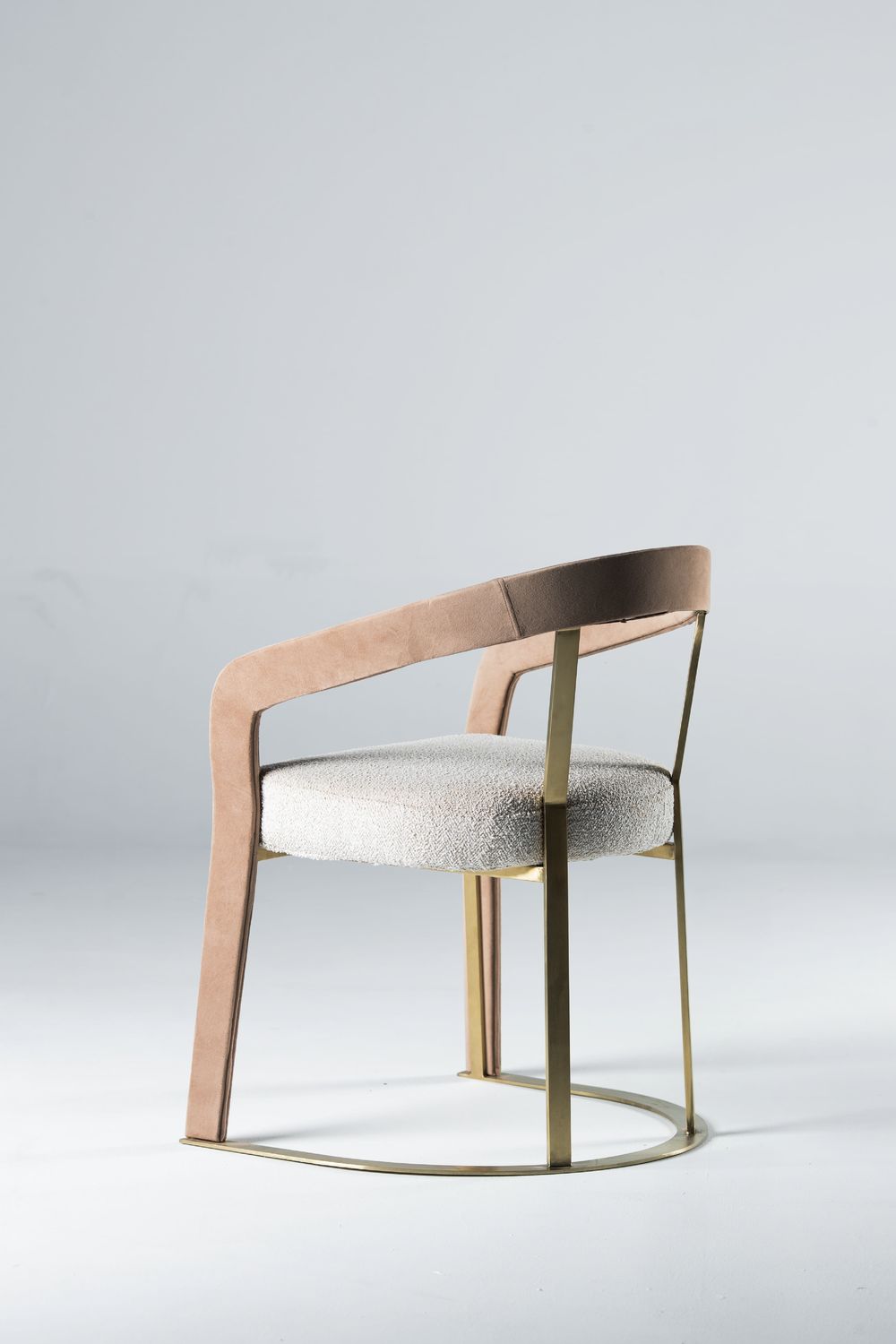 The Opulent Arch Dining/Accent Chair is an embodiment of contemporary elegance and ultimate comfort. It features a unique design combining a curved backrest and armrests, upholstered in soft taupe suede, gracefully embracing a comfortable seat padded with luxurious cream boucle fabric.