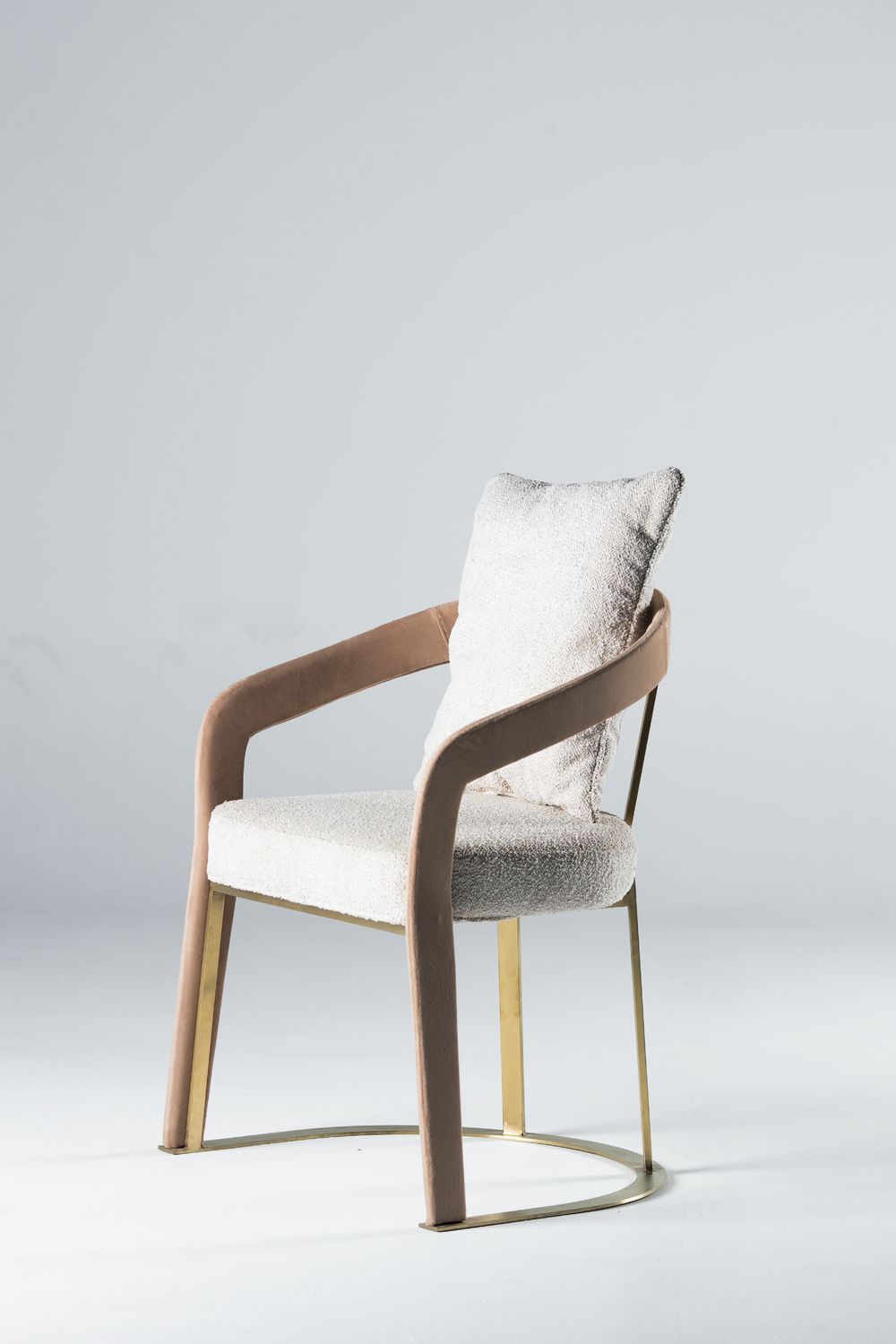 The Opulent Arch Dining/Accent Chair is an embodiment of contemporary elegance and ultimate comfort. It features a unique design combining a curved backrest and armrests, upholstered in soft taupe suede, gracefully embracing a comfortable seat padded with luxurious cream boucle fabric. The chair rests on a meticulously polished gold metallic frame, extending to form a chic arched base, adding a touch of prominent luxury and bold design. An ideal piece to infuse a distinctive sophistication into dining rooms, offices, or reception areas.