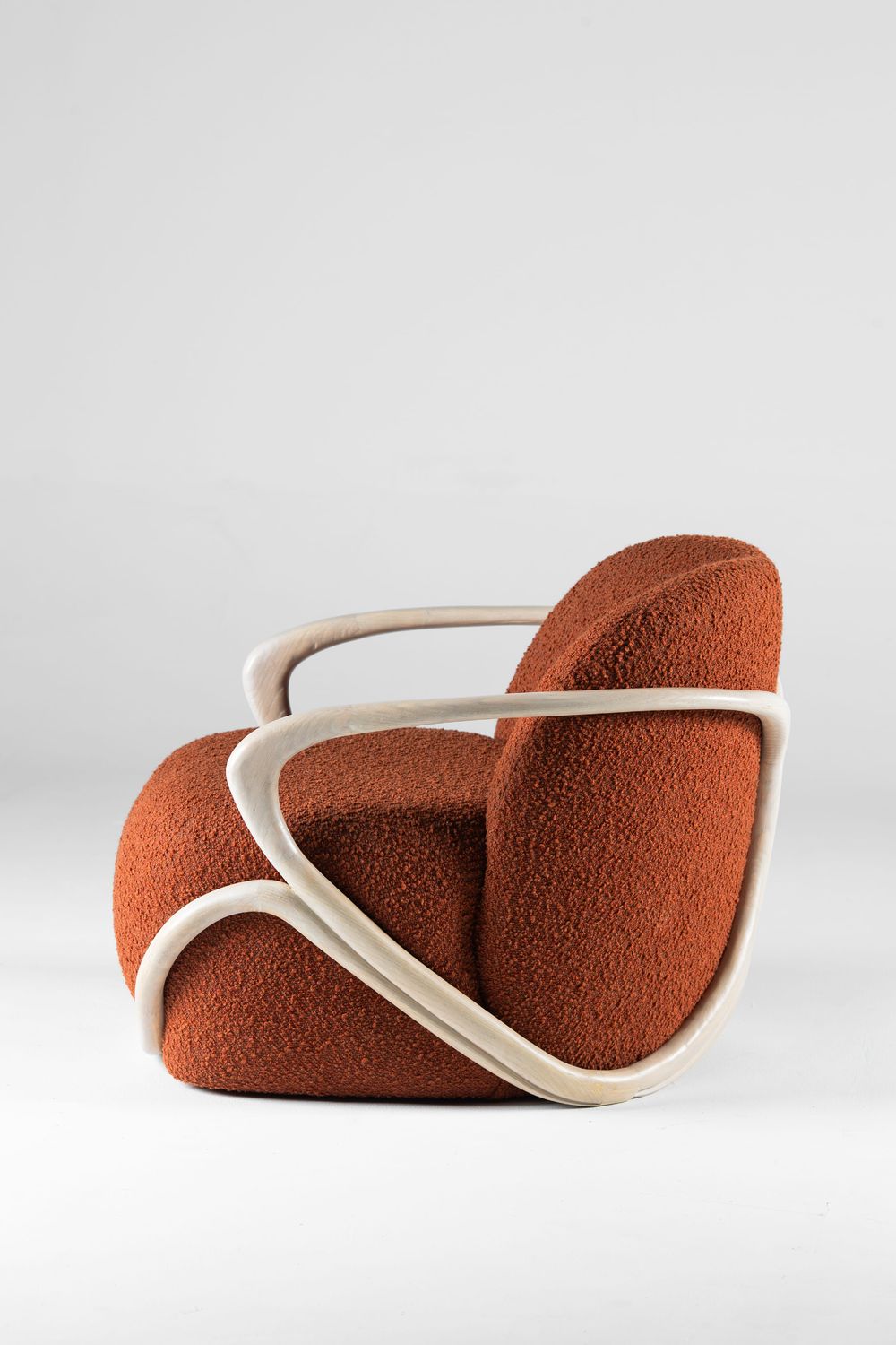 The Serene Curve Armchair is an artistic piece that combines exceptional comfort with captivating architectural design. It features soft, light cream boucle upholstery gracefully enveloping its comfortable frame. The most striking element is its polished, warm-toned bentwood frame, which elegantly wraps around the chair to form stylish armrests and a base, adding a touch of originality and modernity. Ideal for spaces demanding unique luxury and ultimate comfort.